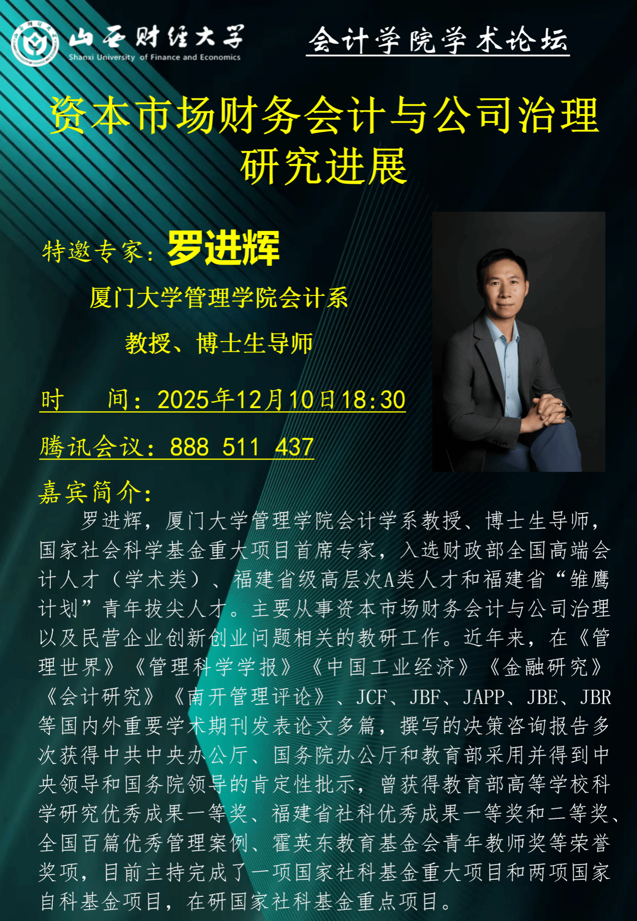 为切实提升我院青年科研骨干国家社科基金申报质量与成功率,理清研究思路、规避申报误区,12月10日,我院举办国家社科基金申报优化提升专题交流会。本次会议特别邀请厦门大学罗进辉教授担任指导专家,我院青年科研骨干教师及硕博研究生参会交流,围绕相关学术研究主题与国家项目申报核心要点,展开深度研讨。