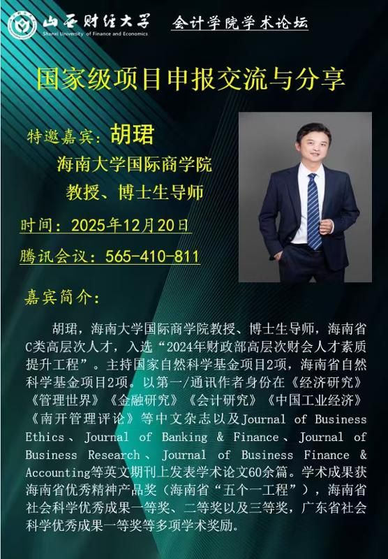 2025年12月20日,我院特邀海南大学国际商学院胡珺教授担任主讲嘉宾,开展国家级项目申报经验交流与分享会。我院青年科研骨干教师及硕博研究生共同参与了本次交流。